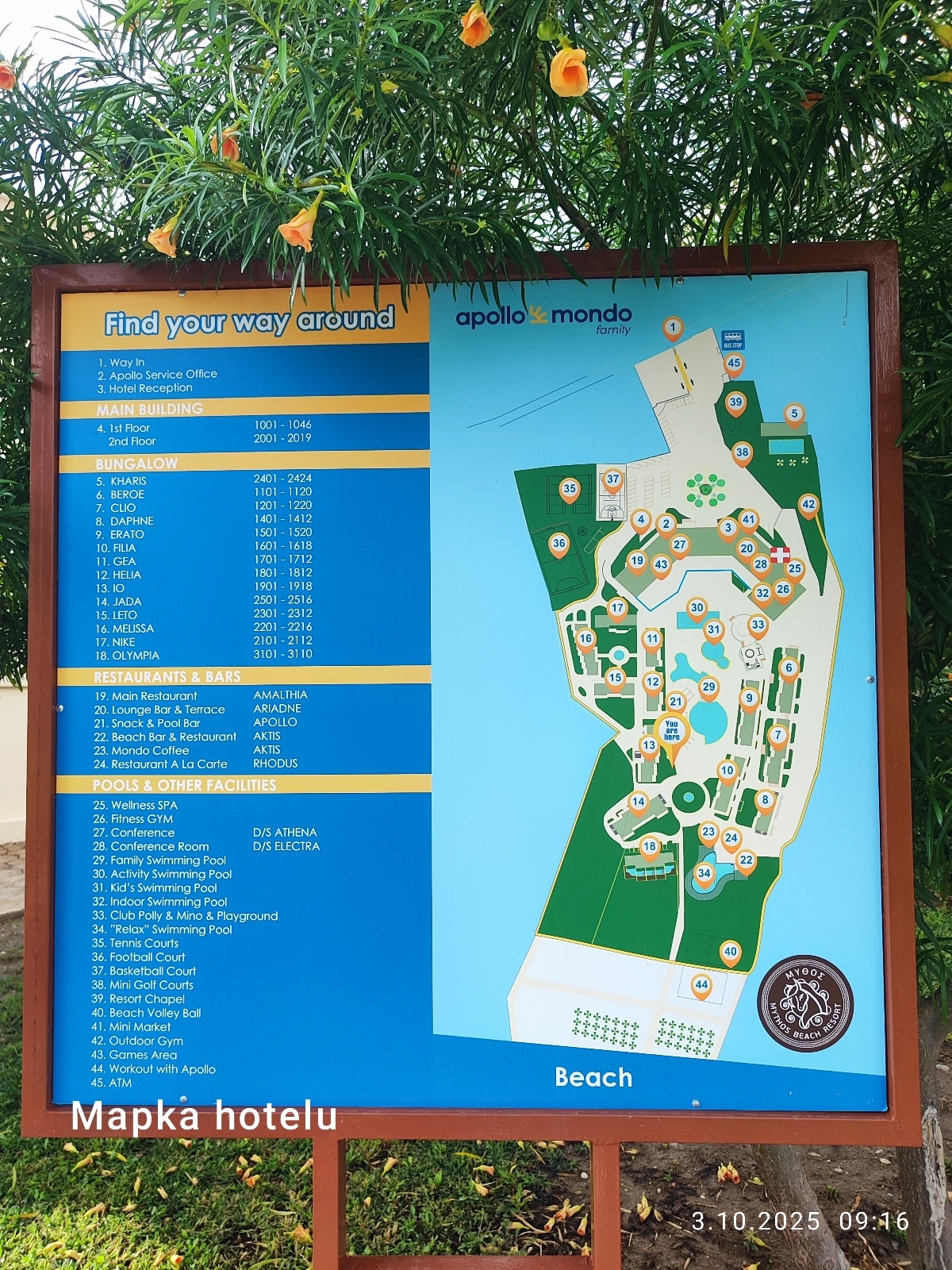Byliśmy w Hotelu Mythos Beach Resort pod koniec września. Rodzina 2+2, Allinclusive, z biura Grecos. PIERWDZE WRAŻENIE👀 Przybyliśmy do hotelu w godzinach późno wieczornych, już po zakończeniu serwowania ostatnich posiłków jednak zostaliśmy zaproszeni do czynnego jeszcze baru gdzie otrzymaliśmy tosty i herbatę. Zobaczcie na zdjęcie mapki hotelu i otoczenia - teren nie jest bardzo rozległy, wszędzie jest blisko. POKÓJ🔑 Pokój rodzinny jaki nam przydzielono to jedno dość duże pomieszczenie z 3 łóżkami szerokimi tapczanami + dostawka. W pokoju był aneks kuchenny, lodówka, średniej wielkości łazienka z wanną i balkon ze stolikiem i krzesełkami. Na balkonie była suszarka na ubrania. W łazience są ręczniki, mydła z dozownikiem, suszarka do włosów. Nie ma płynów czy szamponów hotelowych z czym spotkaliśmy się w innych hotelach 5 gwiazdkowych. Jest bezpłatny sejf, jest TV. PLAŻA 🌞 Plaża znajduje się przy samym hotelu. Nie jest to plaża piaszczysta, raczej żwirowo - kamienista ( zdjęcie poniżej) Zejście do wody jest bardzo łagodne, w wodzie są duże okrągłe kamienie. Buty do wody się przydają. Dużym atutem są bezpłatne leżaki na plaży i pobliski plażowy bar. BASENY I PLAC ZABAW 👙🛝 Jest kilka basenów i osłonięty od słońca brodzik dla maluszków. W basenie woda nieco zimna, ale dzieciaczki nie narzekały, bo świetnie się bawiły na mini parku wodnym ze zjeżdżalnią. Pobliski plac zabaw jest wystarczający do zabawy ( zdjęcie poniżej) Jest też basen wewnętrzny. JEDZONKO 😋 Posiłki w tym hotelu zdecydowanie zasługują na więcej niż 5 gwiazdek. Na pewno nie są monotonne, nawet przy tygodniowym pobycie trudno wszystkiego spróbować. Codziennie są owoce morza, ryby, lokalne potrawy, dużo owoców i sałatek. Tylko zobaczcie na załączonych zdjęciach na te fontanny z czekolady ( były też z ciemnej czekolady) Szkoda, że soki z dystrybutora są dostępne tylko podczas śniadania. Na kolacji kelner przydziela stolik i podaje napoje. W barach bezpłatnie: wata cukrowa, popcorn, gofry, lody, nuggets, snacki, pizza i wiele innych poprawiaczy nastroju 😉 WYCIECZKI 🚗🚍🛥️ Świetnie, że przed hotelem jest przystanek autobusowy. Można dojechać autobusem prawie w każde ciekawe miejsce na wyspie( bilet 4 euro): plaża Tsambika - cała piaszczysta i szeroka, Lindos wraz z koloseum i przepięknym widokiem na serce z zatoki, Rodos - warte odwiedzenia miasto i port. Do innych mniej znanych miejsc można dojechać taksówką ( w hotelu jest cennik) lub wypożyczyć samochód - także w hotelu jest wypożyczalnia.Przykładowo autko małe typu Panda to 55 euro/ 1 dzień; Opel Crossland 95 euro/1 dzień. Osobiście polecam Zatokę Antoniego Quina i rodyjską Stegnę. ROZRYWKA🎩👏 Na terenie hotelu można zagrać bezpłatnie w minigolfa. Nie ma amfiteatru, były 2-3 pokazy na terenie restauracji ( magik, akrobacje i muzyka na żywo). W pobliżu hotelu są wypożyczalnie sprzętów wodnych. Inne atrakcje typu cymbergaj, bilard, gry video - są płatne. WYJAZD✈️ My nie korzystaliśmy, ale po wymeldowaniu do godziny 11 można korzystać z całej infrastruktury hotelowej, jest też ogólnie dostępny prysznic I luggage room.