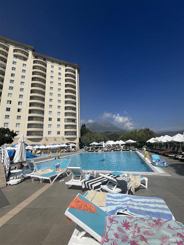 Witam, Zacznę od początku ...Po wylądowaniu i przetransferowaniu z lotniska do hotelu(podróż ok 3h) zameldowaliśmy się w hotelu ok 21:15(jadąc autokarem po cichu liczyliśmy jeszcze,że zdążymy na kolację-niestety nie udało się dotrzeć przed 21 😰) Meldując się w hotelu okazało się,że dla wieczornych gości jest późna kolacja od 0:00-1:00😃 Na te wakacje wybraliśmy się razem z naszymi znajomymi i prosząc na recepcji o 2 pokoje obok siebie dostaliśmy ofertę apartamentu rodzinnego ,z którego skorzystaliśmy.(3 sypialnie + salon + 2 łazienki (w jednej wanna z hydromasażem),w każdym pokoju klimatyzacja,ci uważam za duży plus. Hotel położony na malowniczym wzgórzu(piękne widoki z balkonu) oddalony ok 4 km od plaży( busik jeździ co 30 min) Jesteśmy z żoną osobami,które wolą odpoczynek na basenie niż plaży,więc ten hotel idealnie wpasował się w nasze gusta. Jedzenie smaczne urozmaicone(na kolację było nawet sushi)Bardzo fajnie zrobiony snack bar( gotowych 13 dań( pizza, hamburger,cheeseburger,tortilla, grillowane piersi z kurczaka,) Pokoje sprzątane codziennie , obsługa miła i pomocna. Hotel posiada kilka basenów(sporo leżaków dookoła) i aquapark(zjeżdżalnie czynne od 10-12 i od 14-17), więc nasz syn miał mega frajdę korzystając z uroków zjeżdżalni. Bary czynne od 10:00 -0:00 ( kawa mrożona , lokalne drinki, piwo Efez, dla dzieci slushy ,soki) Za wyjazd zapłaciliśmy 6390zl( 2 dorosłych + dziecko), więc stosunek jakości do ceny uważam za bardzo dobry.
