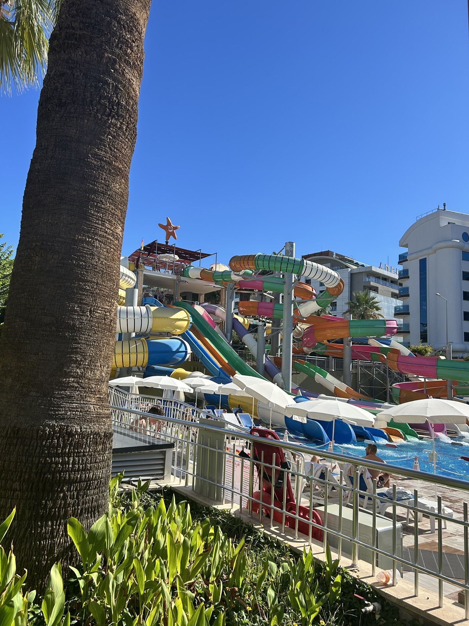 Cały kompleks bardzo duży, kilka basenów, świetne zjeżdżalnie, dużo restauracji, mini zoo, siłownie zewnętrzne, na miejscu dodatkowo płatny park linowy, fryzjer, małpi gaj, kręgle i strefa z automatami oraz oczywiście sklep. Ze względu na rozmiary kompleksu można narobić dużo kroków ale dzięki temu nie ma tam nudy🤭 Plaża wąska i cała w leżakach, zejście do morza łagodne, prawie bez fal a woda w morzu przyjemnie cieplutka. Jedzenie bardzo dobre, choć często pikantne, duzo sałatek. W "godzinach szczytu" ciężko znalezc wolny stolik na stołówce, czasem są spore kolejki do ekspresu do kawy. Byliśmy na bazarze w Alanyi i na bazarze obok hotelu- ceny bardzo zbliżone więc nie ma co sie fatygować do alanyi na zakupy